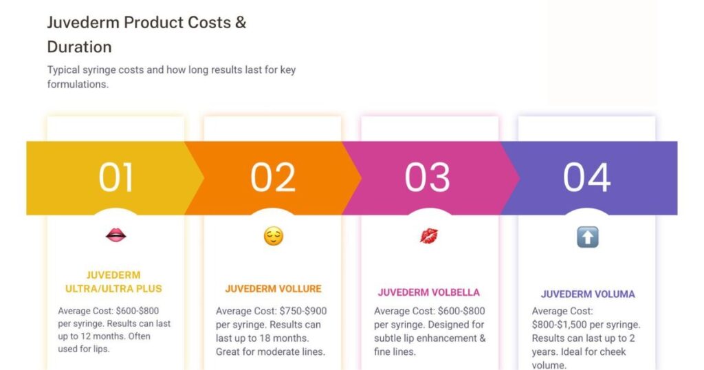 Different brands come with different pricing. Products like Juvederm and Restylane vary in texture, longevity, and cost.
